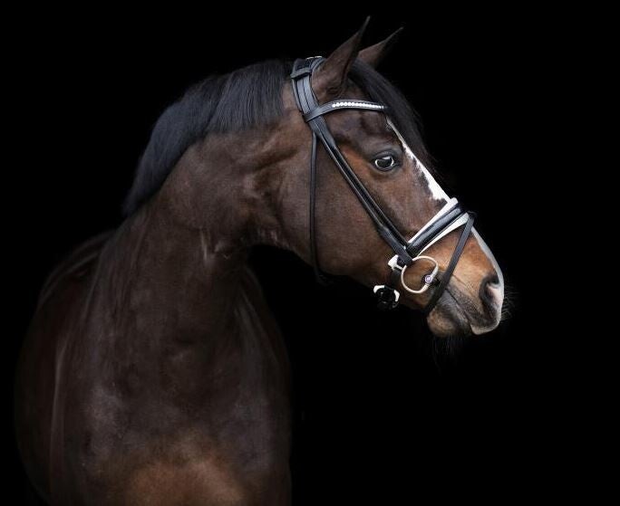 Hoofdstel SERRENTO in Italiaans leder is gemaakt in rond genaaid leder wat het hoofdstel een exclusieve “look” geeft. De bakstukken zijn verstelbaar bovenaan het hoofd maar om te zorgen dat er geen extra druk op de nekspieren komt hebben we een bescherm pad in memory foam voorzien. De aansnoerneusriem is afgewerkt met lak leder. De frontriem heeft Stellux kristallen die met hitte bevestigd zijn.