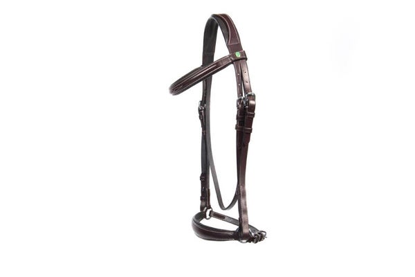 Hoofdstel in hoogste kwaliteit buffelleder met anatomische design kopriem met lage neusriem, linnen teugels met leder stoppers, inox gespen. Sierstiksel op front- en neusriem. Blinde sluiting op bakstukken en teugels