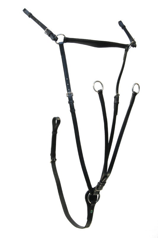 Jachtmartingaal in buffelleder met brugje over schoft, zonder elastiek en met karabijnhalen voor bevestiging aan het zadel. Inox gespen.