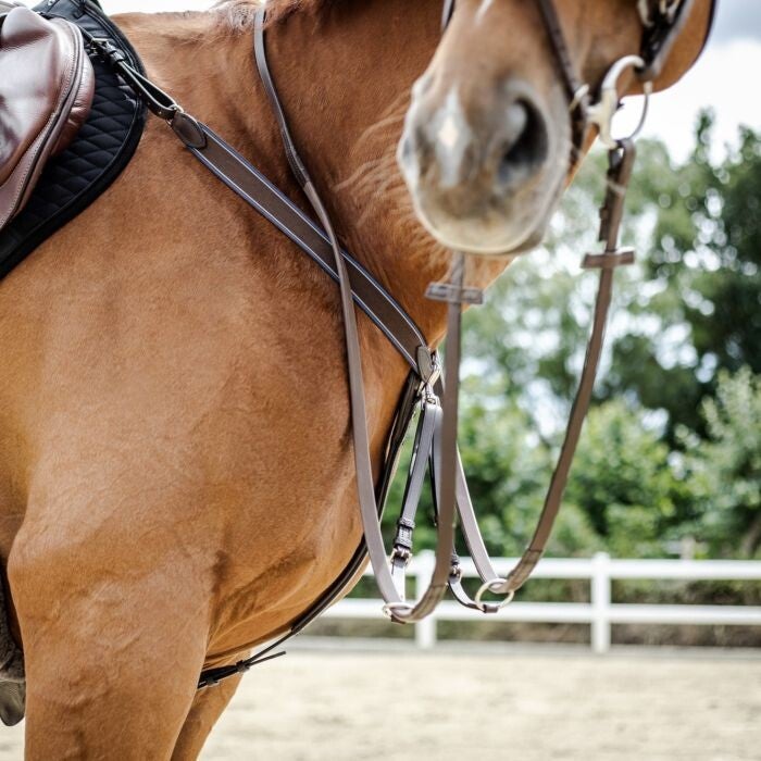 Kwalitatieve borstriem met mooie en stevige elastieken in Stübben-kleuren. Met musketonhaken kan het borsttuig eenvoudig aan de ringen van het zadel worden bevestigd. De gespleten martingaalvork kan ook apart worden aangepast met karabijnhaken, de speciale bevestigingsring is zacht gevoerd aan de kant die naar het paard is gericht. De riem die naar de singel loopt is ook zacht gevoerd in het borstgedeelte. Verkrijgbaar in verschillende kleuren.